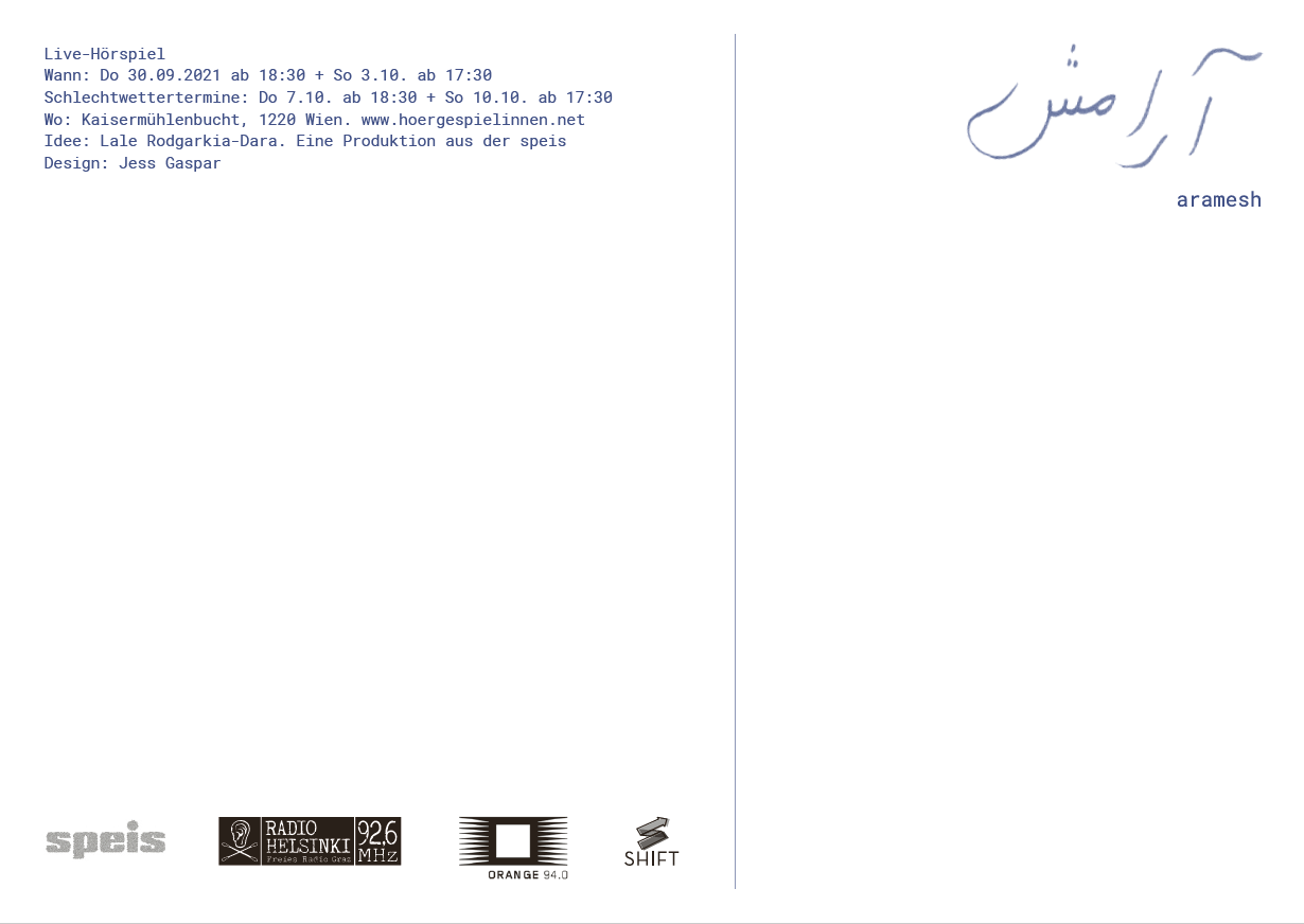 Aramesh – versucht eine literarisch-akustische Auseinandersetzung mit Sound und dem sonischen Spektrum, Gewalt und Krieg. In (fiktionalisierten) Interviews sowie Gesprächen mit in Wien lebenden Personen und zusätzlich im elektroakustisch- literarischen Herantasten in Form eines Live- Hörstücks mit Live-Übertragung und einer Installation im öffentlichen Raum. Das Hörstück/Installation wird auf Deutsch und in den jeweiligen Gesprächspartner*innen-Sprachen sein. Das Narrativ, enthoben der jeweiligen Konfliktzone, soll Biographien schaffen welche frei von Nationalität oder sprachlicher Zuschreibung existieren.